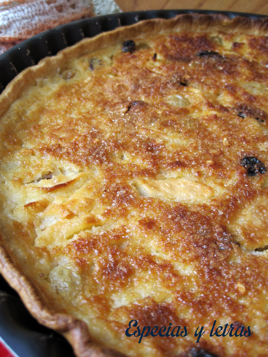 Enharinamos el molde, extendemos la pasta brisa y forramos en el molde. Pinchamos la base. Espolvoreamos el azúcar moreno y la almendra. Mientras hacemos el relleno, la dejamos en la nevera. Pelamos y cortamos los melapios en gajos que frotaremos con el limón. Hacemos el relleno batiendo los huevos, el azúcar y añadiendo la nata, el extracto de vainilla, la mantequilla derretida, la maicena y la almendra molida. Mezclamos bien para que no nos queden grumos y añadimos la compota que integraremos bien. Sacamos la masa de la nevera, colocamos los gajos de los melapios por todo el fondo, alternando con las uvas, pasas, arándanos y los frutos secos. Vertemos la mezcla de nata. Espolvoreamos con un poco de azúcar moreno. Metemos en el horno precalentado a 190º unos 35 minutos o hasta que esté doradita.